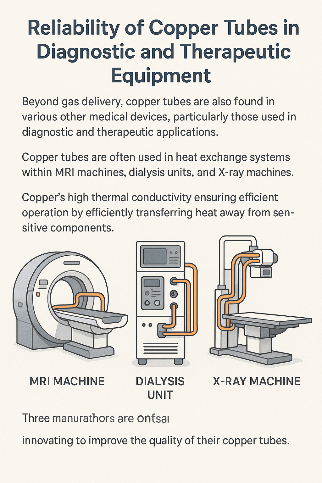 গ্যাস সরবরাহের বাইরে, তামার টিউবগুলি অন্যান্য বিভিন্ন মেডিকেল ডিভাইসেও পাওয়া যায়, বিশেষ করে যেগুলি ব্যবহার করা হয় ডায়গনিস্টিক এবং থেরাপিউটিক অ্যাপ্লিকেশন . উদাহরণস্বরূপ, তামার টিউবগুলি প্রায়শই ব্যবহৃত হয় তাপ বিনিময় সিস্টেম এমআরআই মেশিন, ডায়ালাইসিস ইউনিট এবং এক্স-রে মেশিনের মতো চিকিৎসা সরঞ্জামের মধ্যে। তামার উচ্চ তাপ পরিবাহিতা নিশ্চিত করে যে এই মেশিনগুলি সংবেদনশীল উপাদানগুলি থেকে দক্ষতার সাথে তাপ স্থানান্তর করে দক্ষতার সাথে এবং নিরাপদে কাজ করে।