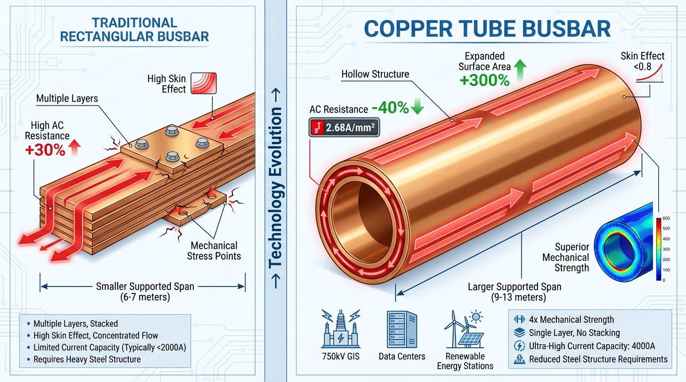 এই কাঠামোগত বিপ্লব সরাসরি অতি-উচ্চ-কারেন্ট ট্রান্সমিশনের ব্যথা পয়েন্টগুলিকে সম্বোধন করে। 750kV গ্যাস-ইনসুলেটেড সুইচগিয়ারে (GIS), একটি Φ100×5mm তামা টিউব বাসবার 4000A এর কারেন্ট বহন করতে পারে, যার বর্তমান ঘনত্ব মাত্র 2.68A/mm²। বিপরীতে, সমতুল্য আয়তক্ষেত্রাকার বাসবার প্রয়োজন একাধিক স্ট্যাক করা স্তর , 30% এর বেশি ক্ষতি বৃদ্ধির দিকে পরিচালিত করে। আরও সমালোচনামূলকভাবে, তামার টিউব বাসবারের যান্ত্রিক শক্তি আয়তক্ষেত্রাকার বাসবারের চেয়ে চারগুণ। 50kA-এর একটি শর্ট-সার্কিট বর্তমান প্রভাবের অধীনে, স্থগিত স্প্যানটি 9 মিটারে পৌঁছায় এবং সমর্থিত স্প্যানটি 13 মিটার পর্যন্ত প্রসারিত হয়, যা উল্লেখযোগ্যভাবে সাবস্টেশন ইস্পাত কাঠামোর প্রয়োজনীয়তা হ্রাস করে।