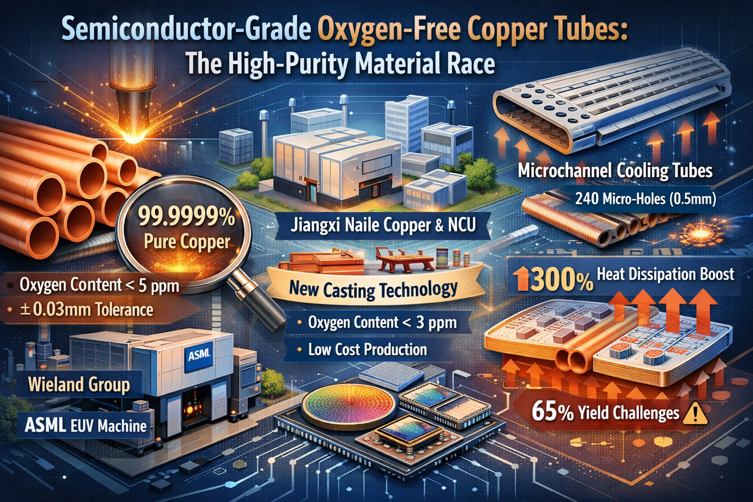 মধ্যে ব্রেকথ্রু খরচ কার্যকর বিকল্প উদ্ভূত হয়। জিয়াংসি নাইল কপার, নানচাং বিশ্ববিদ্যালয়ের সহযোগিতায়, একটি "অতি-লো অক্সিজেন বিভক্ত অনুভূমিক অবিচ্ছিন্ন ঢালাই পদ্ধতি" তৈরি করেছে যা আমদানি করা ভ্যাকুয়াম পদ্ধতির এক-অষ্টমাংশে 3ppm এর নিচে অক্সিজেন সামগ্রী নিয়ন্ত্রণ করে। এই উদ্ভাবনটি SMIC-এর 14nm উৎপাদন লাইনের সাপ্লাই চেইনে প্রবেশ করেছে। আরও উন্নত অ্যাপ্লিকেশনের সাথে ওয়েফার-লেভেল কুলিং টিউব অন্তর্ভুক্ত মাইক্রোচ্যানেল ডিজাইন (যেমন, 0.5 মিমি ব্যাসের 240 মাইক্রো-হোল) 300% দ্বারা তাপ অপচয়ের দক্ষতা বাড়ানোর জন্য, যদিও ফলনের হার 65% এ একটি চ্যালেঞ্জ রয়ে গেছে।