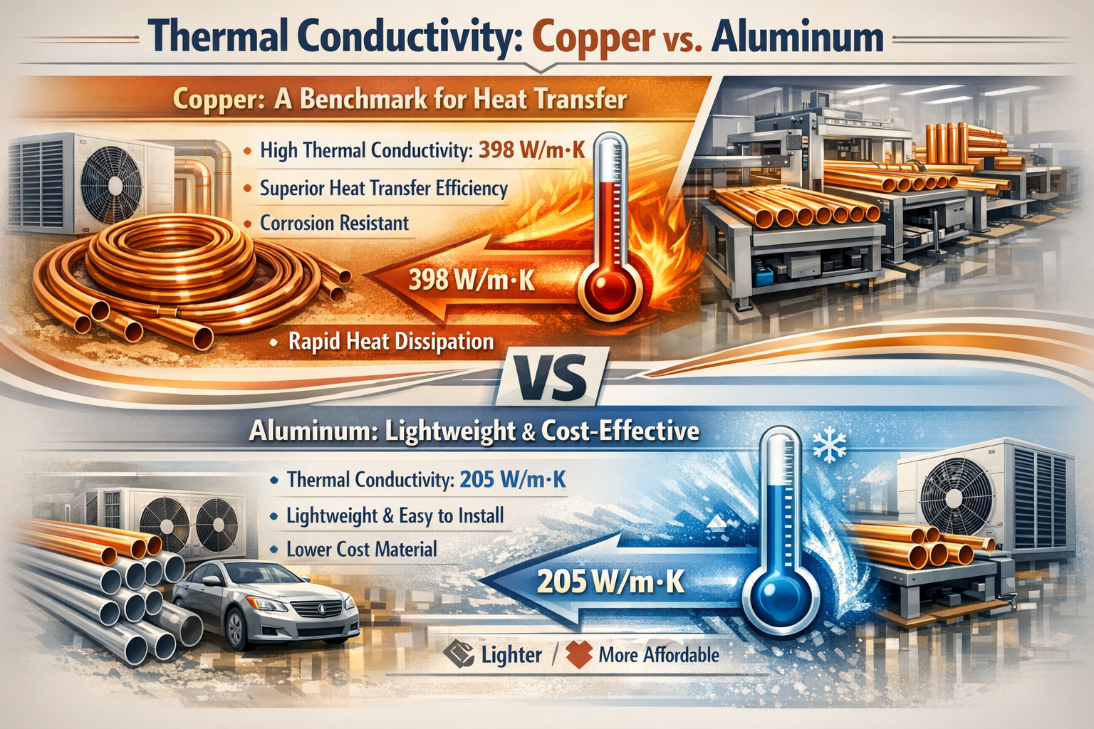 মধ্যে পার্থক্য স্পষ্টভাবে কল্পনা করতে তামা এবং অ্যালুমিনিয়াম টিউব, এখানে তাদের মূল বৈশিষ্ট্যগুলি হাইলাইট করে একটি তুলনা টেবিল রয়েছে: