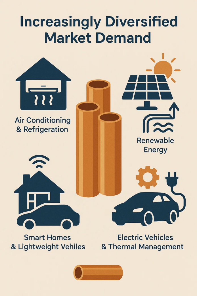 স্মার্ট হোমস, লাইটওয়েট যানবাহন এবং বিদ্যুতায়নের ত্বরান্বিত বিকাশের সাথে, তামা টিউবগুলির প্রয়োগের পরিস্থিতিগুলিও প্রসারিত হচ্ছে। উচ্চ-পারফরম্যান্স কপার টিউবগুলি কেবল বাড়ির সরঞ্জামগুলিতে কনডেন্সার এবং বাষ্পীভবনকারীদের জন্য মূল উপাদানই নয়, নতুন শক্তি যানবাহনের তাপীয় ব্যবস্থাপনায় সিস্টেমগুলিতেও গুরুত্বপূর্ণ ভূমিকা পালন করে। এই বাজারটি বাড়তে থাকবে বলে আশা করা হচ্ছে।