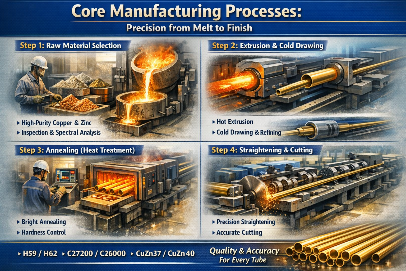 একটি ব্রাস টিউবের গুণমান নির্ধারিত হয় চুল্লিটি চার্জ হওয়ার মুহূর্তে। ক্র্যাকিং বা অকাল ক্ষয় সৃষ্টিকারী অমেধ্য প্রতিরোধ করতে আমরা উচ্চ-বিশুদ্ধতা তামা এবং দস্তাকে অগ্রাধিকার দিই।