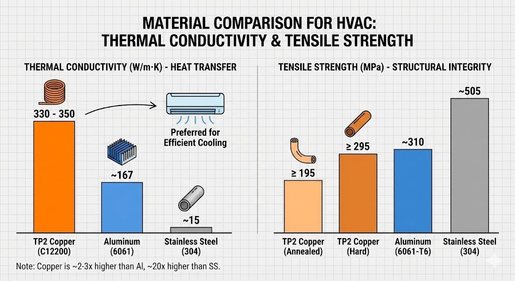 বৈশিষ্ট্য বিভাগে উল্লিখিত হিসাবে, TP2 এর তাপ পরিবাহিতা ব্যতিক্রমী। একটি তাপ এক্সচেঞ্জারে, এটি করার অনুমতি দেয় দ্রুত তাপ স্থানান্তর একটি ছোট পদচিহ্নে, কমপ্যাক্ট, উচ্চ-দক্ষ এয়ার কন্ডিশনার ইউনিটের নকশা সক্ষম করে।