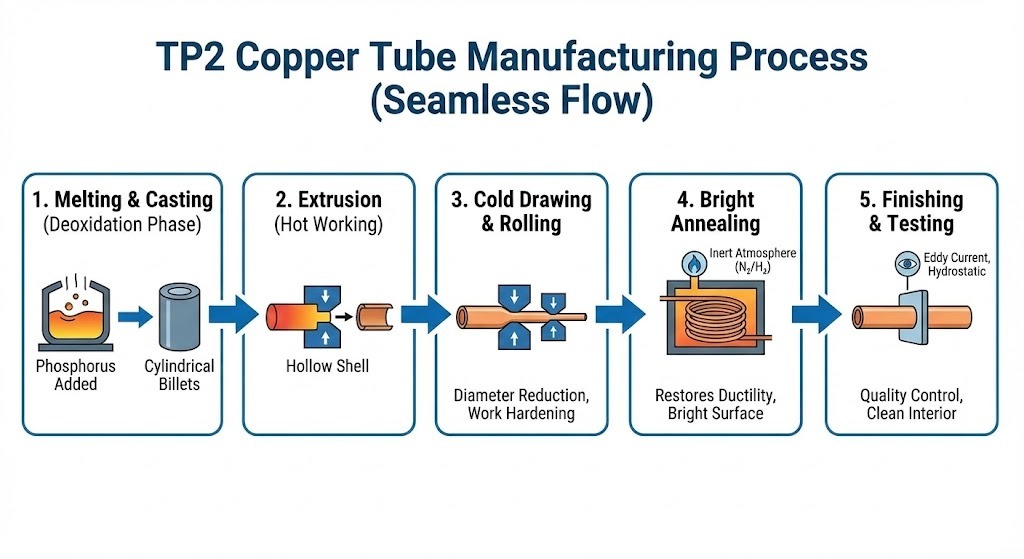 TP2 কপার টিউবগুলির উত্পাদন হল উচ্চ-তাপ গন্ধ থেকে উচ্চ-নির্ভুল ঠান্ডা কাজ পর্যন্ত একটি যাত্রা। সর্বাধিক প্রিমিয়াম TP2 টিউব হিসাবে উত্পাদিত হয় বিজোড় টিউব , যা ঢালাই-সীম ব্যর্থতার ঝুঁকি দূর করে।