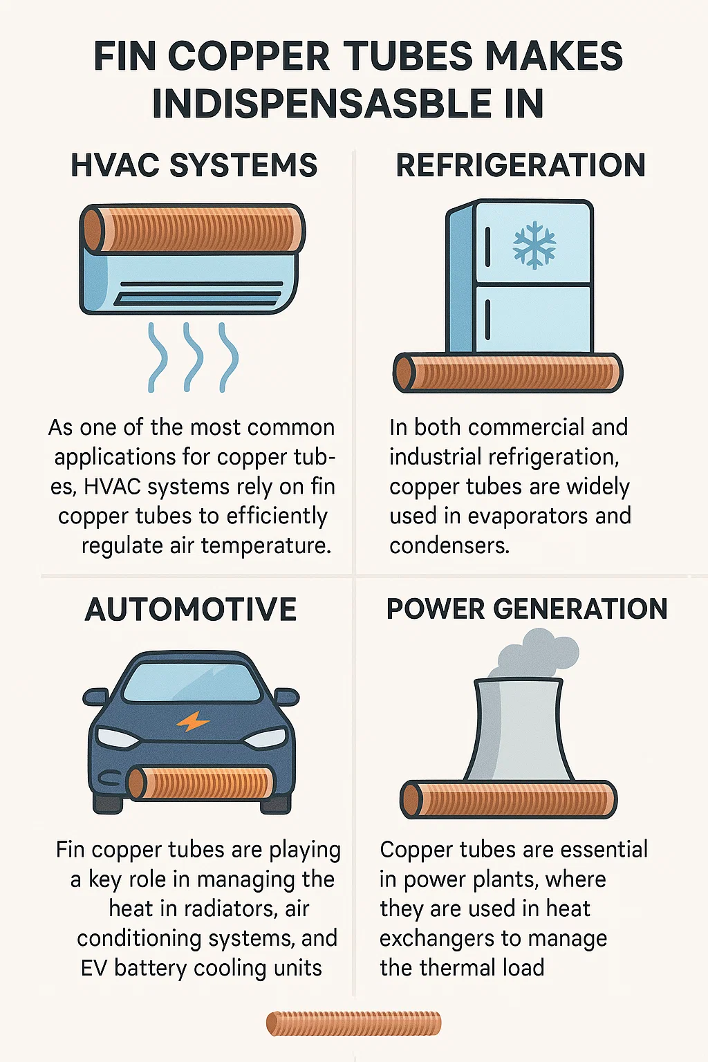 এর বহুমুখিতা পাখনা তামার টিউব এগুলিকে অসংখ্য শিল্পে অপরিহার্য করে তোলে, যেমন: